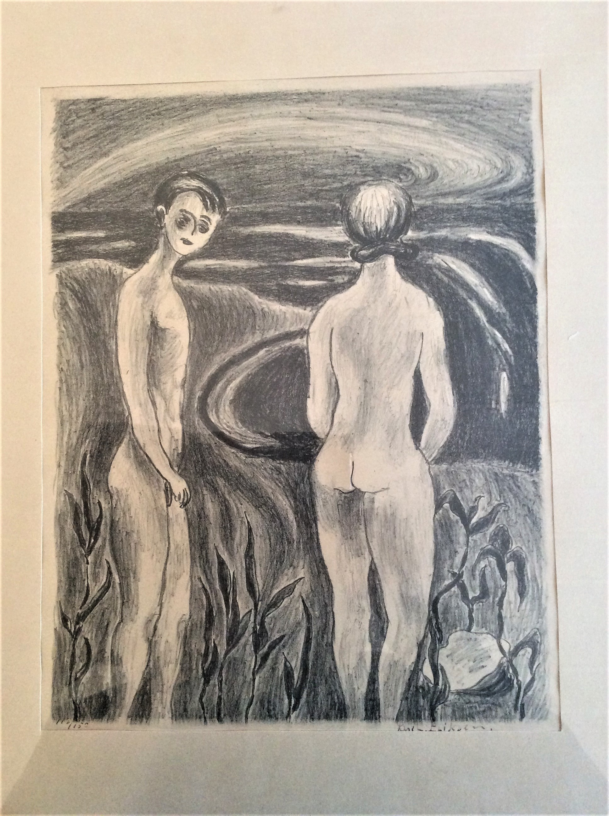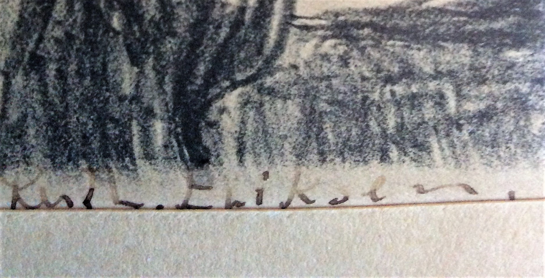 Här kan jag direkt se på stilen att det INTE är pappas verk. Men det är också svårt att avgöra vad signaturen säger? Jag är inte säker på att förnamnet ska vara Rolf? Handstilen liknar inte någon av de andra, så det är svårt att avgöra om det beror på en omogen handstil eller om det är ett helt annat namn. Men eftersom det är en numrerad upplaga av ett tryck kan man gissa att konstnären ändå inte är alltför ung.