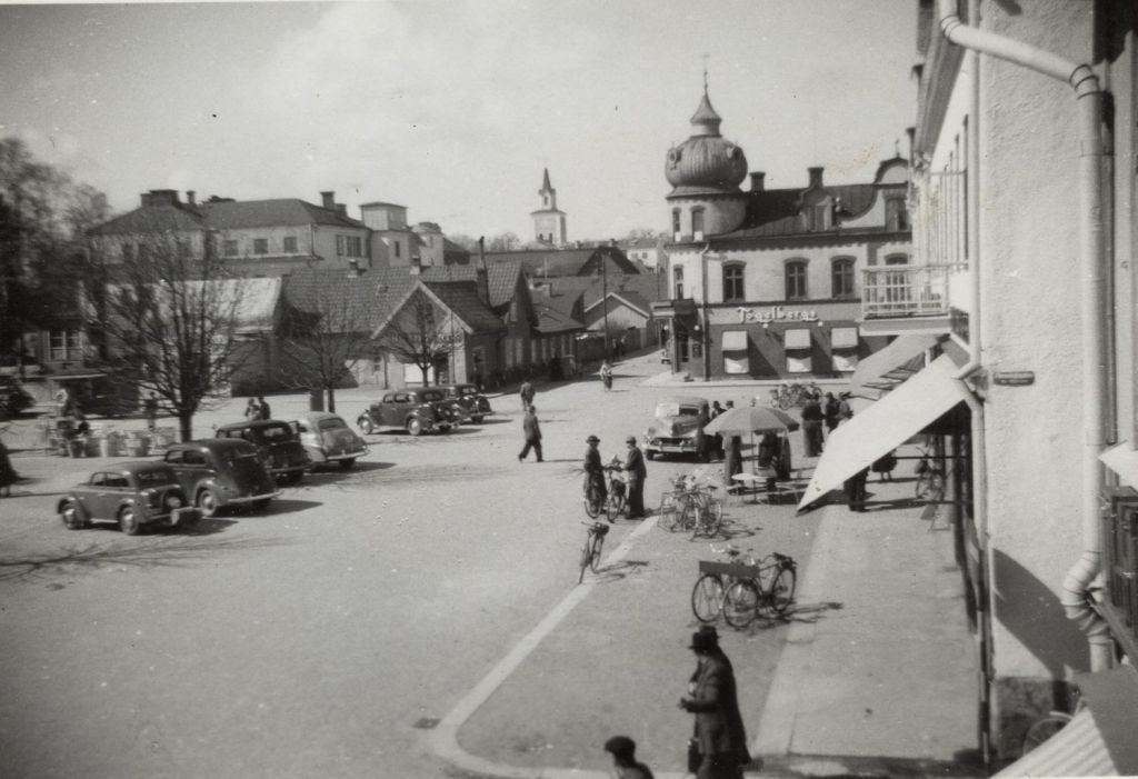 När jag sökte på den beskurna bilden av pappas tavla fick jag napp på den gamla bilden i mitten. Den beskrevs som ”Fogelbergska huset i Ljungby”. Har sedan sökt vidare och hittat fortsättningen på platsens öde. Fogelbergska revs 1964 och 1966 stod ett modernt EPA-hus klart. Kan inte hjälpa att jag tycker det är sorgligt.