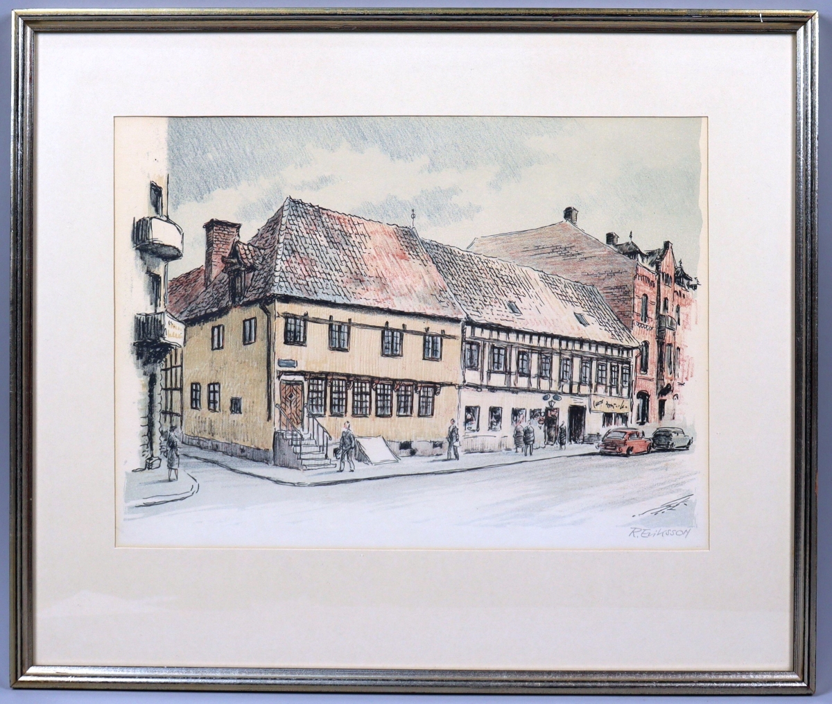 Beskrivning: Bagersgatan mot Östergatan. Till vänster vid hörnet av Humlegatan står det Diedenska huset, vilket egentligen borde kallas Niels Roeds gård efter byggherren på 1620-talet. Senare renoverades huset, putsen togs bort och numera syns korsvirkeskonstruktionen. Kallas även ibland för Siegbahnska huset. Till höger Thottska huset. Fotograf: Axel Paulsson Datering: 1960-tal