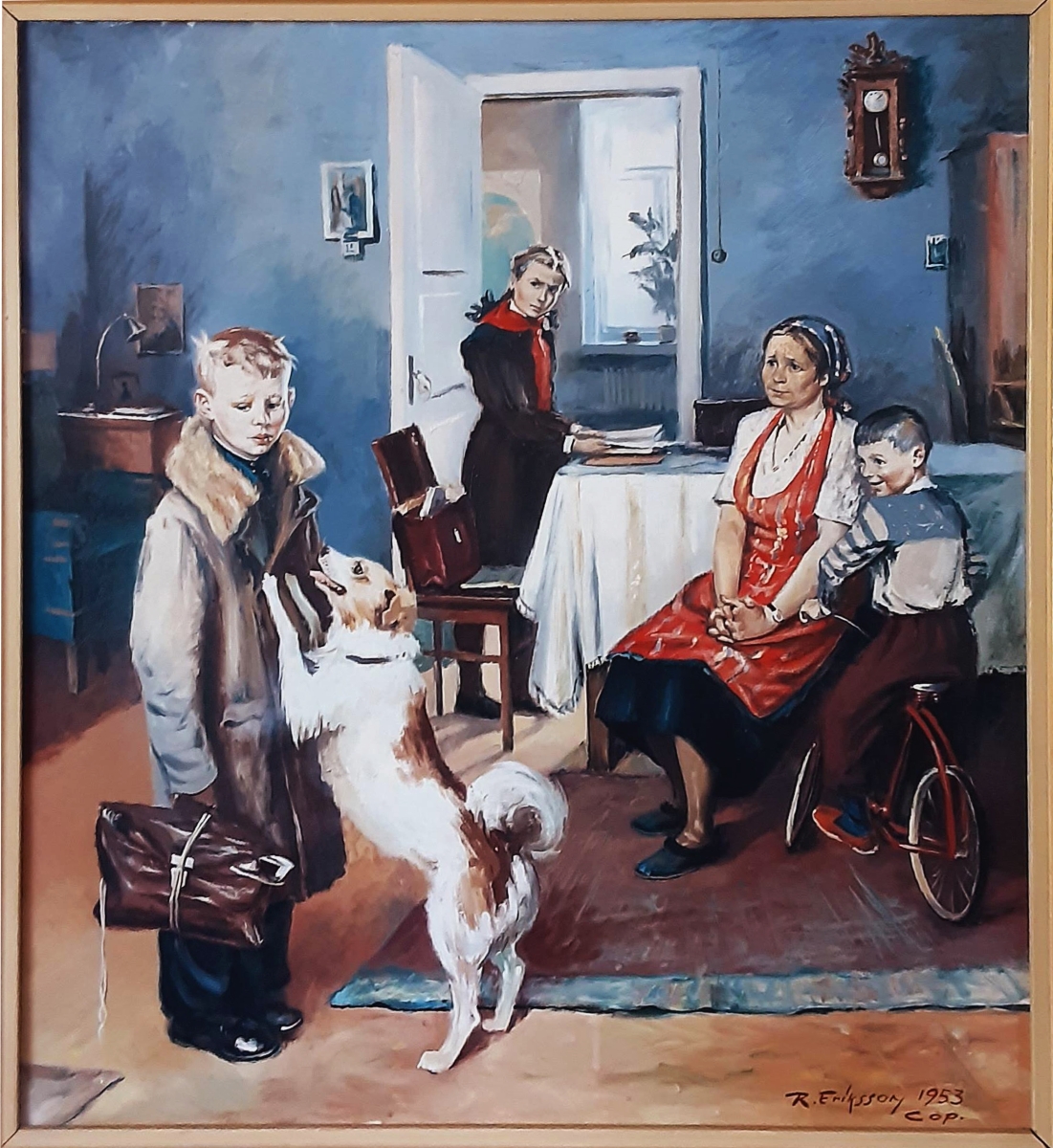 This powerful work shows a Russian boy whose father has died in the war returning from an exam. The boy has inherited his father’s coat, even though he is too small to fit it. He has also metaphorically inherited his father’s responsibility to provide for the family. The family’s hopes depend on him yet he returns with low marks. The mother and sister seem keenly aware of the significance, whereas the boy’s faithful dog is glad about the boy’s arrival.
